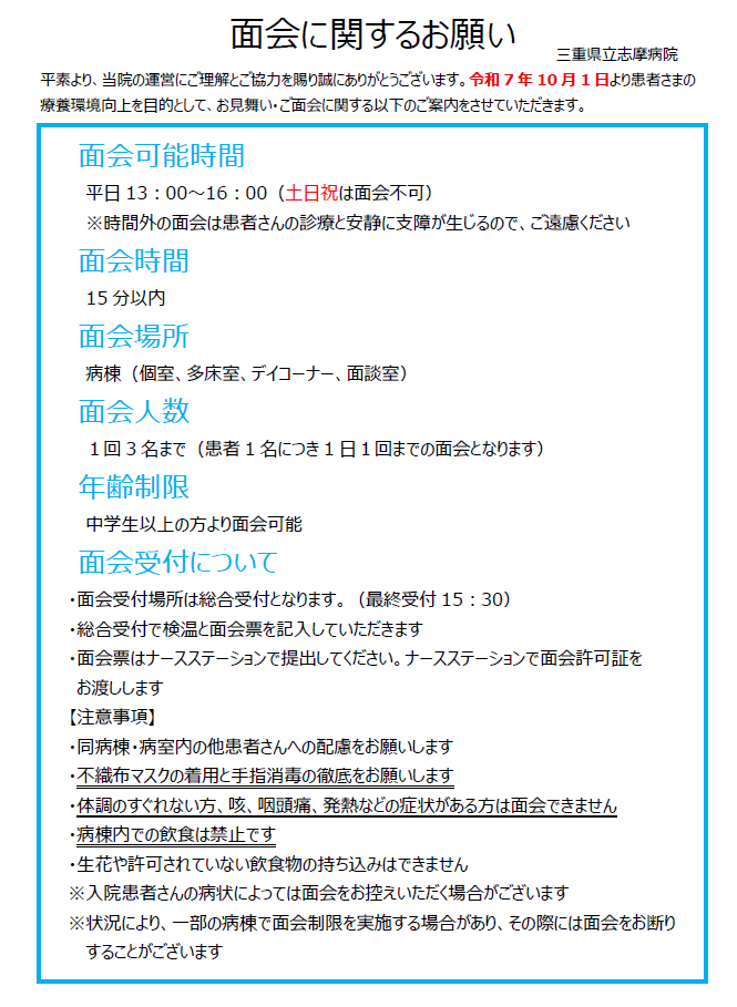 ・感染性疾患の流行状況や、患者様の症状や診療等の都合により面会ができない場合や、お待ちいただく場合があります