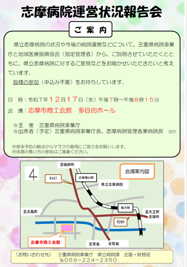 ご説明させていただくとともに、県立志摩病院に対するご意見などをお聞かせいただきたいと考えています。